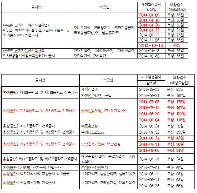 이 외에도 대형 건설사(현대건설, 삼성물산, 대림산업, 한화건설등)중심으로 시공중인 「미8군 병영시설 및 보육센터 건설공사」현장에서도 2건 사고가 발생한 것으로 나타났다.