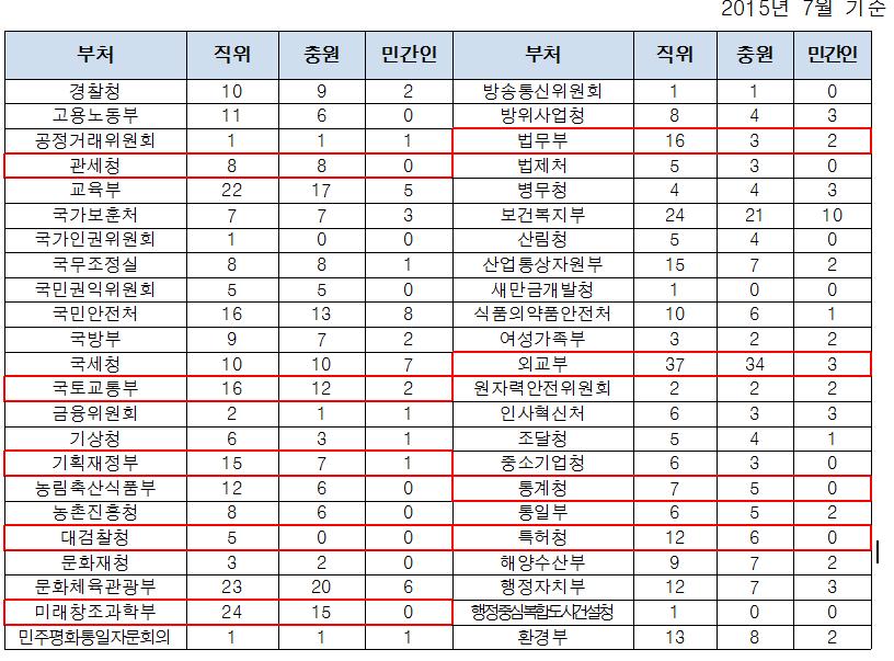 이밖에 미래창조과학부 ․ 관세청 ․ 특허청 ․ 통계청 등 전문화된 부처의 경우에도 충원인원 모두가 공직경력자라는 지적이다.