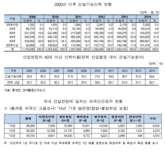 건설현장에서 40대 이상 기능 인력이 차지하는 비중은 2009년 74.1%, 2010년 77.4%, 2011년 79.0%, 2012년 80.7%, 2013년 81.8%로 해마다 증가하고 있는 것으로 나타났다. 반면 30대 비중은 2009년 19.8%에서 2013년 13.1%, 20대는 6.0%에서 4.9%로 하락했다.