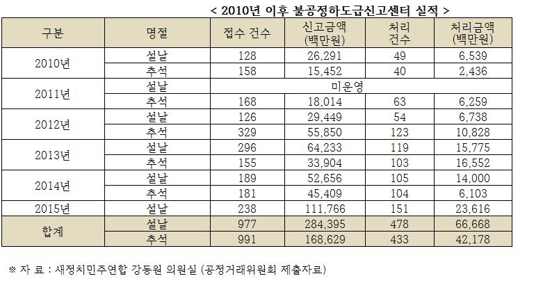 10일 국회 국토교통위원회 소속 새정치민주연합 강동원 의원(남원·순창)이 공정거래위원회로부터 제출받은 자료에 따르면, 최근 5년간 명절을 앞두고 한시운영 중인 신고센터에 하도금대금을 받아 달라고 접수된 총 1,968건 중 46.3% 수준을 처리했으나, 금액기준으로 신고받은 4,530억원 중 24.2%에 해당하는 1,088억원만이 처리된 것으로 드러났다.