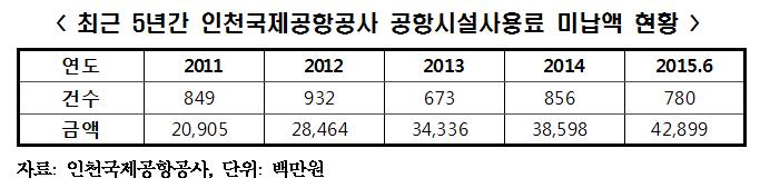 10일 새누리당 이노근 의원이 인천공항공사로부터 받은 자료에 따르면 지난달 6월까지 최근 5년간 공사가 받지 못한 시설사용료는 428억원이다.
