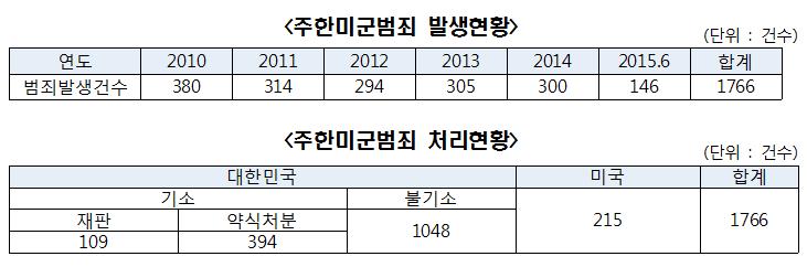 10일 국회 정무위원회 소속 유의동(새누리당, 경기 평택을) 의원이 법무부에서 제출받은 자료에 따르면, 2010년 이후 발생한 주한미군범죄(총 1,766건) 중 1,551건이 우리 사법당국에 의해 처리되었고, 그중 1,048건이 불기소 처리되어 불기소율이 67.6%에 달하는 것으로 드러났다.