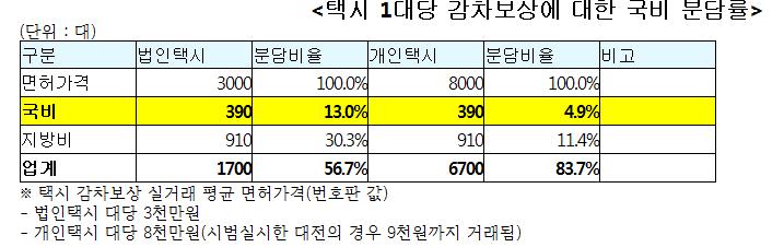 이에 대해 이찬열의원은 “정부는 택시 면허별 번호판 가격이 개인택시 8000만원, 법인택시 3000만원으로 계상하여 1대당 390만원 지원하는데, 감차보상금에 대한 정부와 지자체, 업계의 분담률을 비교하면, 정부는 법인택시의 경우 13.0%, 개인택시의 경우 4.9% 정도만 지원하고 있어 업계의 부담이 가장 크다.”고 밝혔다.