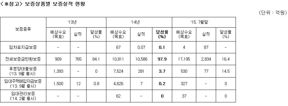 실제 임차료지금보증은 14년 67억원을 계획했으나 7백만원을 보증하는데 그쳤고, 후분양대출보증도 ‘13년 1,393억원을 계획했으나 실적이 전무, ’14년에는 7,524억원을 계획했으나 3.7%인 281억원 보증에 그쳤다.