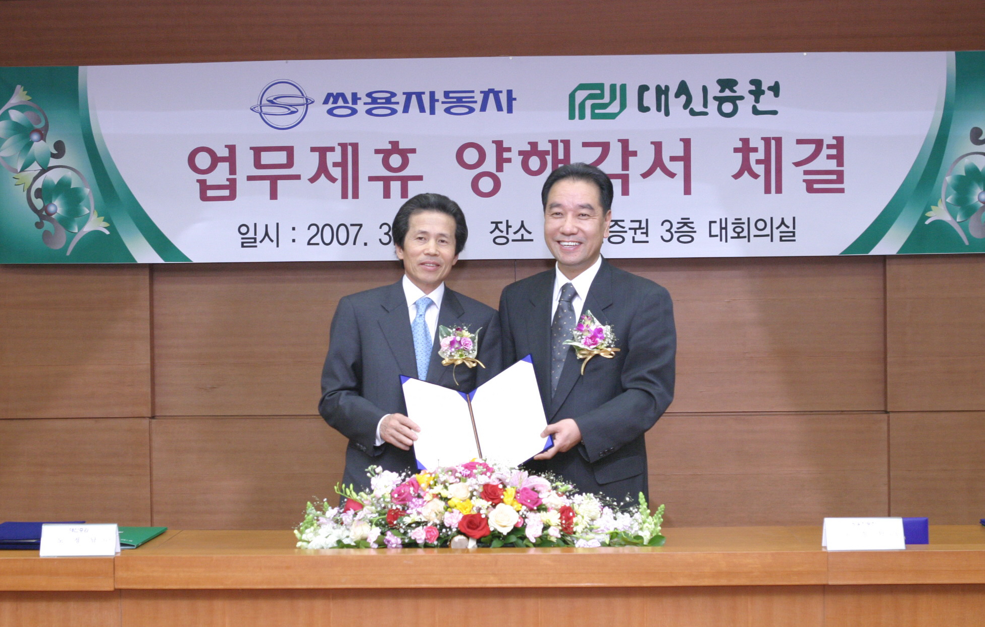 대신증권은 13일 여의도 대신증권 본사에서 쌍용자동차와 업무제휴를 체결했다. 대신증권 노정남 사장(왼쪽)과 쌍용자동차 최형탁 사장이 업무제휴 양해각서를 체결한 후 기념 촬영을 하고 있다.