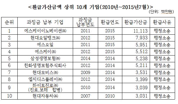 같은 기간(2010년~2015년7월) 공정위가 행정소송에 패소하면서 과징금과 함께 지급한 환급 가산금액을 기업별로 살펴보면, SK이노베이션이 111억으로 가장 많았으며, 현대오일뱅크 79억, 에스오일 59억, 에스케이 55억, 삼성생명 52억원 순으로 공정위가 환급가산금으로 10억원 이상을 지급 한 건수만도 22건에 달했다.