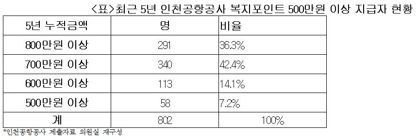 14일 변재일 의원(새정치민주연합, 청주시)은 인천공항공사가 제출한 ‘인천공항공사 최근 5년 복지포인트 지급액’자료를 분석한 결과, 5년 동안 복지포인트 지급액이 500만원 이상인 자가 802명으로 전체 공항직원의 80%에 달하였고 700만원 이상인 경우도 631명에 달한다고 밝혔다.