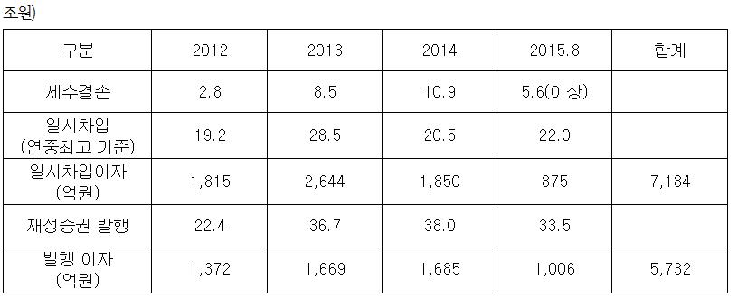 14일 새정치민주연합 김영록 의원이 밝힌 바에 따르면 2012~2015년까지 4년 연속 세수결손에 예산 조기집행까지 겹치면서 부족한 예산을 메꾸기 위해 한국은행으로부터 일시차입과 재정증권 발행이 급속히 증가하면서 이에 따른 이자만 1조2900억원을 지급한 것으로 확인되었다.