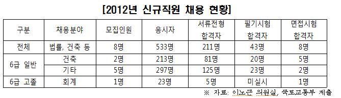 당시 서류전형 합격자 81명 중 17명은 경력기간에 대한 평가점수를 반영하지 않아 부당하게 탈락한 사람들 대신 합격한데다 특히 응시자 박모씨는 총 7년3개월간 건축분야에 근무하였고 학교성적 점수, 어학점수 및 자격증 점수를 합하면 213명 중 4위로 합격했어야 하지만 서류심사에서 탈락한 것으로 드러났다.