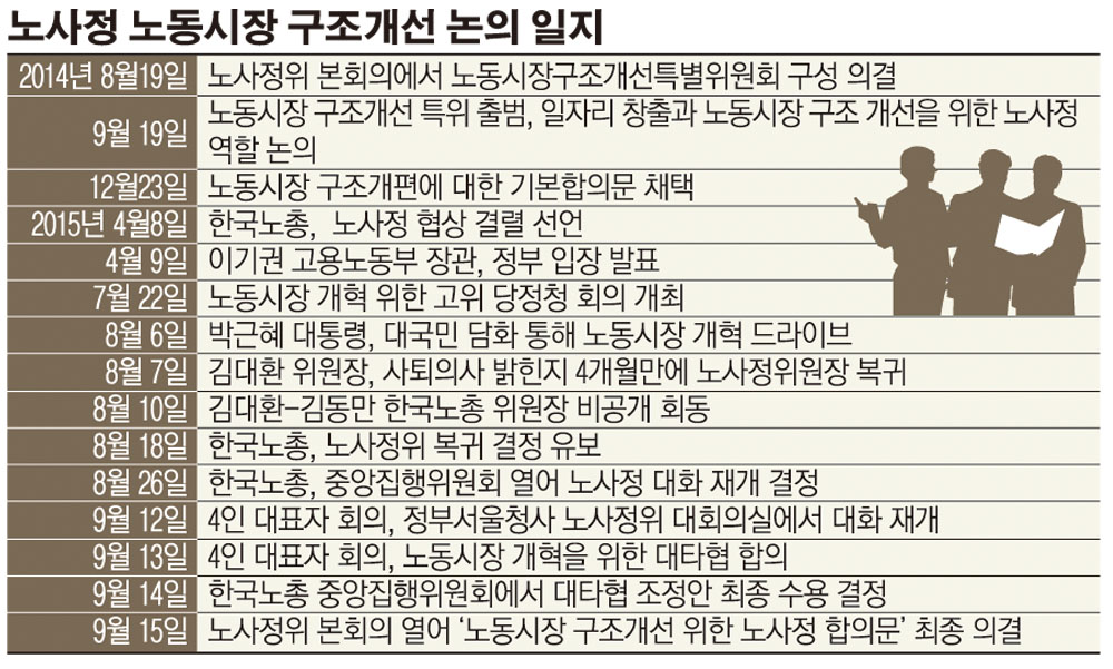 이에 따라 지난해 9월 19일 노사정이 일자리 문제 해결을 위해 사회적 대타협이 필요하다는 데 공감하고 ‘노동시장 구조개선 특별위원회’를 구성한 이후 지난 1년간 진행됐던 노사정 대타협은 결실을 맺게 됐다. 1998년 2월 정리해고 도입 등에 합의한 이후 17년 만의 성과다.