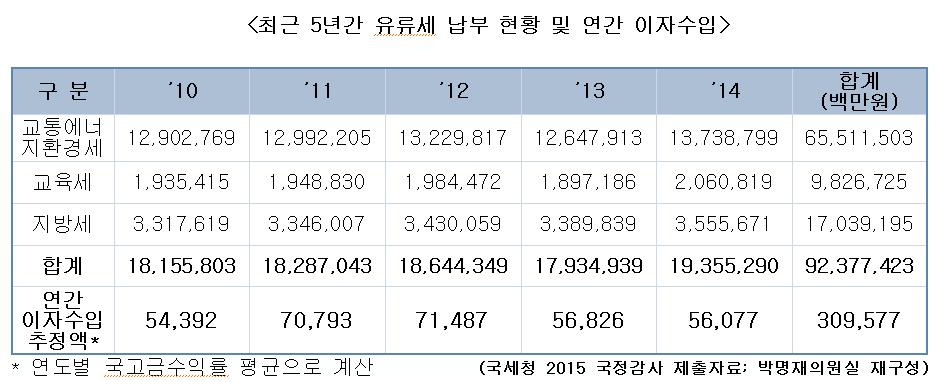 15일 국회 기획재정위원회 새누리당 박명재 의원(포항남구·울릉)이 국세청으로 부터 제출받은‘최근 5년간 유류세 납부 현황’자료를 분석한 결과, 최근 5년간 유류세 신고 납부 금액은 92조 3,774억원으로 연간 20조원에 달하는 세금을 정유사들이 평균 45일간 보관함으로써 현행 국고금 수익률인 2%대의 이자율만 적용해도 최근 5년간 3,095억 원(추정)의 이자수입을 얻을 수 있었던 것으로 나타났다.