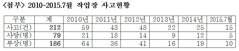 16일 국회 국토교통위원회 소속 변재일 국회의원(새정치민주연합, 청주시 청원구)이 한국도로공사로부터 제출받은 ‘고속도로 작업장 교통사고 현황’에 따르면, 지난 2010년부터 올 7월까지 최근 5년간 작업장 사고는 모두 212건이었으며, 이 중 사망사고는 79건이 발생한 것으로 나타났다.