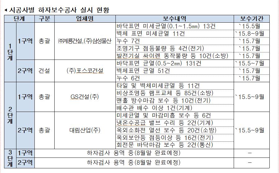 공정거래위원회, 기획재정부, 농림부, 해수부, 국토부, 환경부 등 가장 많은 부처들이 위치해있는 1단계 2구역의 경우 바닥과 벽체 균열만 182건에 달한다.