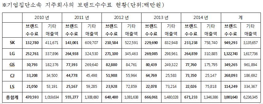 2010년부터 2014년 말까지 LG와 SK를 포함한 5개 대기업 지주회사의 ‘브랜드 수수료’ 수취현황을 조사한 결과 매년 점차적으로 증가 추세에 있는 것으로 확인되었다. 국회 김기식 의원실에서 조사한 자료에 따르면, 브랜드 수수료를 징수하는 5개 지주회사의 경우 그 금액이 2010년 4700억 에서 2014년 6710억 수준으로 40% 늘어났다.