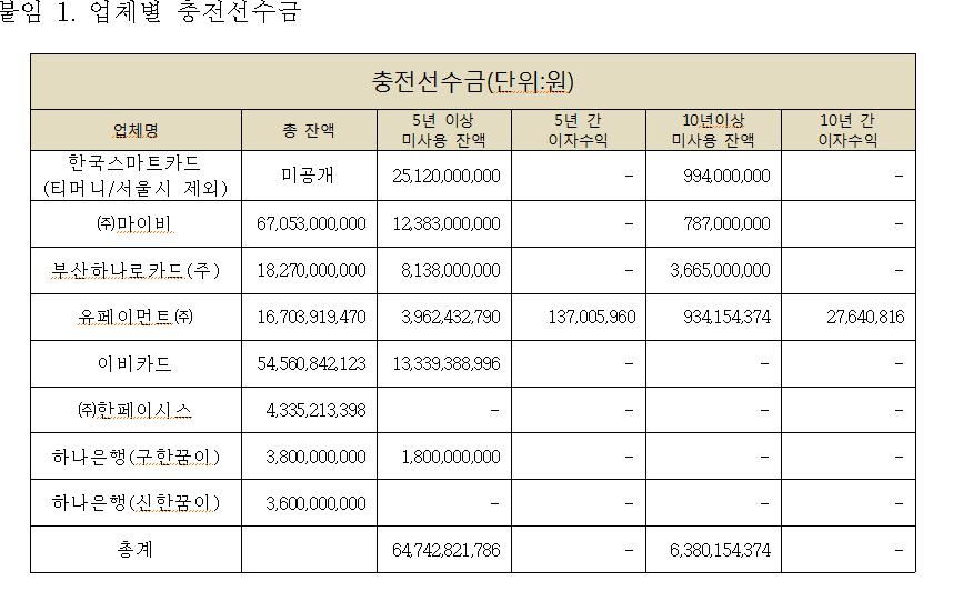 교통카드사는 장기 미사용 충전 선수금으로 수억대의 이자 수익을 거두고 있음에도 이를 수익으로 구분지어 관리하지 않고 있고, 내부 영업 비밀을 이유로 이자 수익액 조차 공개하지 않고 있다.