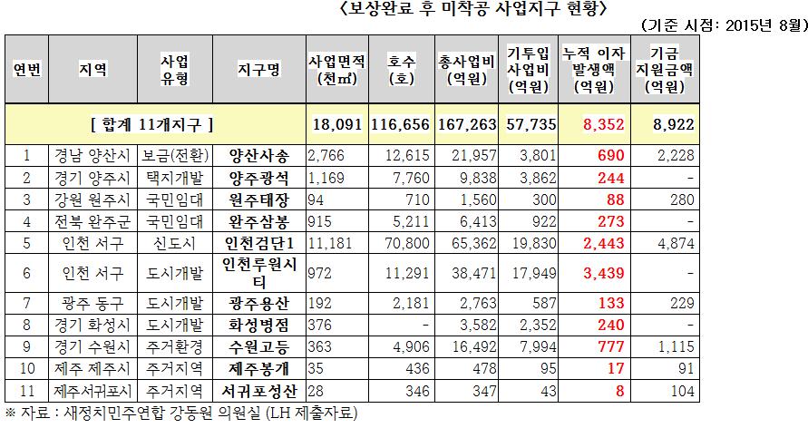 17일 국회 국토교통위원회 소속 새정치민주연합 강동원 의원(남원·순창)이 LH로부터 제출받은 자료에 따르면, 토지보상 이후 3년 이상 착공하지 않은 전국의 11개 장기 미착공 사업지구에서 빠져나간 이자만 천문학적인 8,352억원에 달하는 것으로 나타났다.