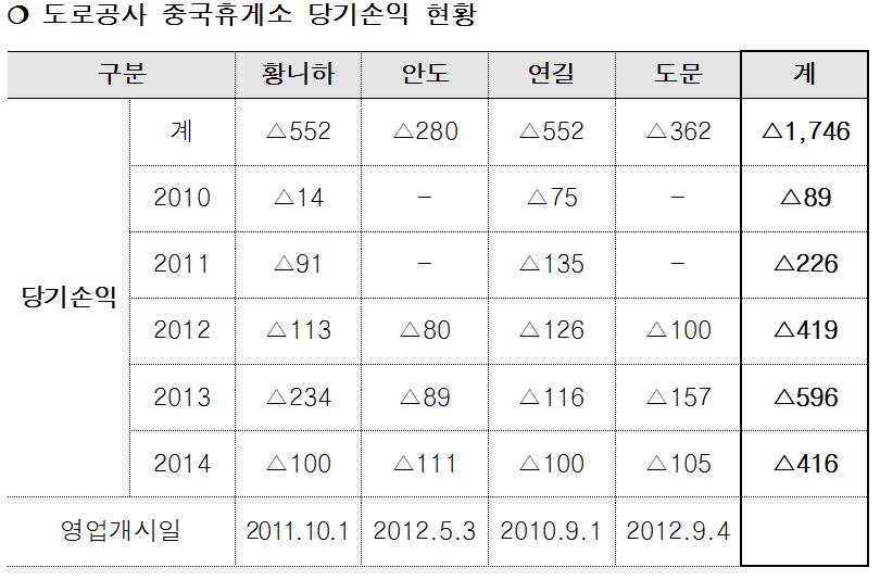 도로공사가 50만 달러를 출자하여 설립한 중국휴게소 4곳은 진출 첫해인 2010년 9천만원의 적자를 시작으로, 2011년 2억 3천만원, 2012년 4억 2천만원, 2013년 6여억원으로 매해 적자규모가 1.5~2배 가량 증가하였고, 2014년 또한 4억원의 적자를 기록했다. 요컨대 중국 진출 이후 해외휴게소에서 단 한곳, 단 한해도 순익을 내지 못한 것이다.