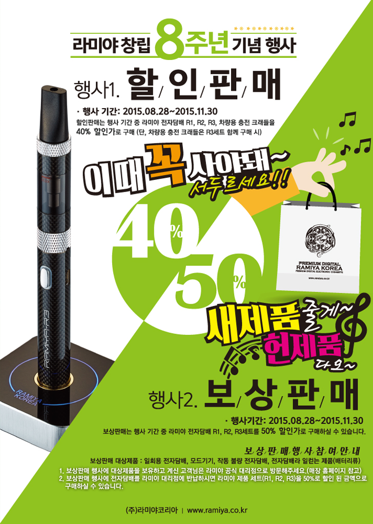 창립 8주년을 기념해 오는 11월 30일까지 진행되는 라미야코리아의 보상판매 이벤트는 전자담배 전 브랜드를 대상으로 한다. 고장난 제품. 배터리, 일회용 담배, 모드 기기 중 1개를 반납하면 라미야 R1, R2, R3 등을 50% 할인된 가격인 7만원 대에 구입할 수 있다.