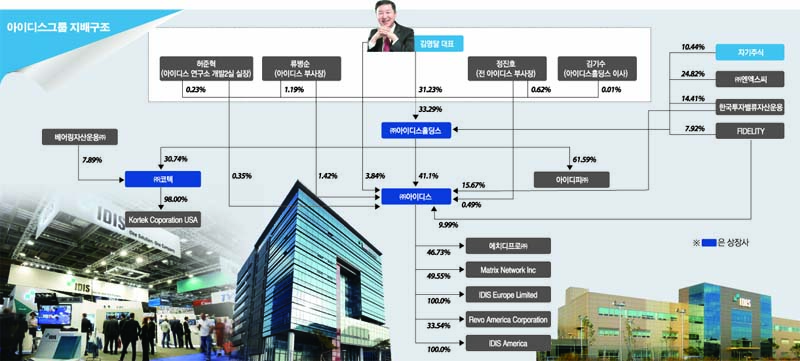 김 대표의 특수관계인으로 류병순 아이디스 부사장이 홀딩스 지분 1.19%를 갖고 있다. 또 정진호 전(前) 아이디스 부사장(0.62%), 허준혁 아이디스 연구소 개발2실장(0.23%), 김기수 아이디스홀딩스 이사(0.01%) 등을 포함한 최대주주 측 지분은 33.29%에 달한다.