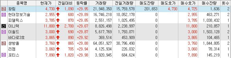 이밖에 현대정보기술(종가 2955원), 피델릭스(3785원), 이니텍(1만1800원), 리켐(종가 3060원), 포티스(7890원) 등이 상한가 명단에 이름을 올렸다.