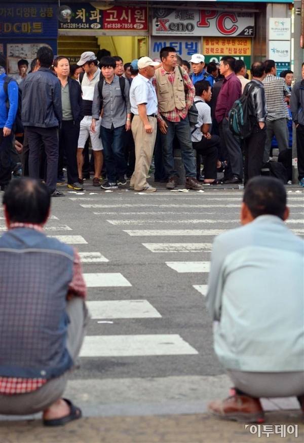 추석을 사흘 앞둔 24일 서울 가리봉동 남구로역 삼거리 일대의 인력사무소 앞에서 일자리를 구하지 못한 근로자들이 서성이고 있다. 이날 한 근로자는 “추석이 다가오자 일거리는 줄어드는데 사람은 더 많이 몰려 며칠째 공쳤다”고 말했다. 신태현 기자 holjjak@