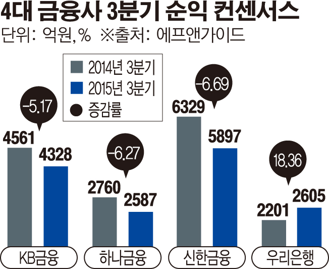올 3분기 우리은행이 4대 금융사 중 유일하게 성장세를 이어갈 것으로 전망됐습니다.