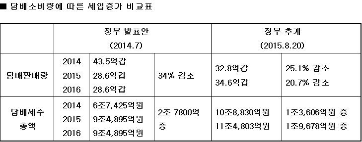 그러나 기재부는 올해 8월 20일, 담배판매 감소율을 당초 34%에서 올해 25.1% 감소한 32억8000만갑으로 조정하고, 이에 따른 담배세수도 당초 9조4895억원에서 10조8830억원으로 조정했다.
