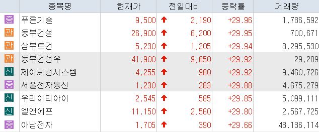 이밖에 동부건설(종가 2만6900원), 동부건설우(종가 4만1900원), 아남전자(종가 1705원)도 상한가 명단에 이름을 올렸다.