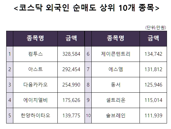 12일 코스닥 외국인 순매도 상위 10개 종목