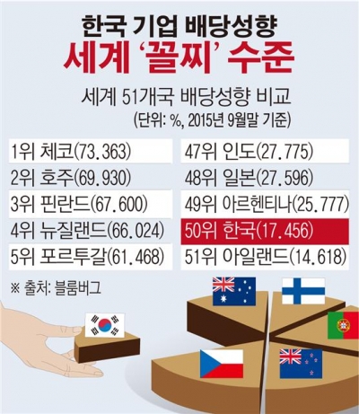 한국 기업의 배당성향은 세계 꼴찌 수준인 것으로 나타났다. 13일 블룸버그 집계에 따르면 올해 9월 말 기준 한국 기업들의 배당성향은 평균 17.456%로, 집계 대상 51개국(유로존 포함) 가운데 50위를 기록했다. 배당성향은 당기순이익 가운데 현금으로 지급된 배당금 총액의 비율이다.