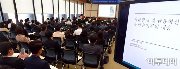 김남훈 하나금융경영연구소 연구위원이 13일 서울 소공동 한국은행 본점에서 열린 ‘2015년 한국은행 지급결제제도 콘퍼런스’에 참석해 ‘지급결제 및 금융혁신 동향과 금융기관의 대응’을 주제로 발표하고 있다. 이날 콘퍼런스에선 지급결제 및 금융혁신 동향, 소비자 보호 및 소액결제시장 혁신 지원의 필요성에 대한 논의와 관련기관의 대응방향 등이 제시됐다. 신태현 기자 holjjak@