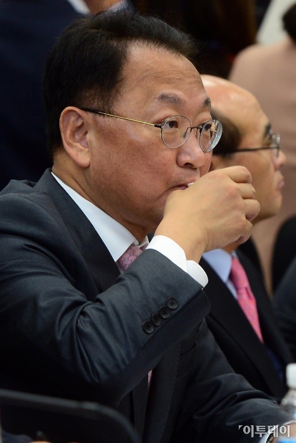 유일호 국토교통부 장관이 14일 오전 여의도 국회 새누리당 정책위의장실에서 열린 가뭄 대책 마련 당정협의에서 모두발언 후 물을 마시고 있다. 이날 열린 당정협의에서는 가뭄 피해 지역 농수 확보 방안 등을 논의한다. 노진환 기자 myfixer@