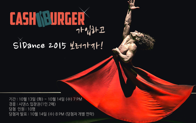 참여방법은 10월 13일(화)에서 14일(수) 오후 7시까지 스마트폰의구글플레이스토어에서 캐시버거(http://bit.ly/1jjFgSc)를 다운로드 한후 신규로 회원가입을 하고 추천인ID로 ‘서울세계무용축제’를 입력하면 자동으로 응모된다.