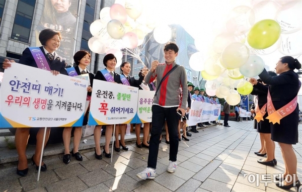 교통안전공단 관계자들이 14일 서울 태평로 프레스센터 앞에서 시민들에게 풍선을 나눠주며 교통안전에 대해 알리고 있다. 이번 행사는 ‘사람이 우선, 자동차는 차선’이란 슬로건으로 정부와 교통안전 유관기관이 함께 추진하고 있는 교통사고 감소대책의 성과를 높이고 교통문화 선진화를 위한 국민들의 공감대 형성과 적극적인 참여를 유도하기 위해 마련됐다. 신태현 기자 holjjak@