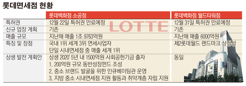 소공점은 지난해 매출이 1조9763억원으로 국내 1위 면세점이다. 서울 시내 6개 면세점의 지난해 총 매출액(4조3502억원)의 45.4%를 차지한다. 월드타워점은 매출액이 6000억원 규모로 소공점에는 못미치지만, 신격호 롯데그룹 총괄회장의 숙원사업인 롯데월드타워라는 롯데그룹의 상징성과 향후 성장 가능성 등을 고려한다면 내줄 수 없는 곳이다.