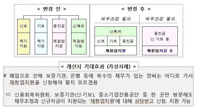 채무조정이 필요한 재기지원자의 지원창구도 신용회복위원회의 ‘재창업지원’ 사업으로 간소화했다.