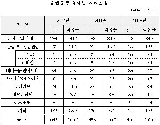 연간 분쟁건수 감소는 전통적인 증권분쟁의 유형인 임의·일임매매과 관련한 분쟁이 줄었기 때문이다. 지난해 143건이 발생해 2004년(234건)과 2005(169건)에 이어 지속적으로 감소했다.