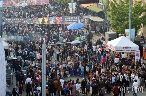 ‘2015 이태원 지구촌 축제’가 18일 서울 이태원동 일대에서 열린 가운데 이태원대로가 참관객들로 붐비고 있다. 세계 각국의 관광객들이 함께한 이태원 지구촌 축제에선 세계 민속의상 패션쇼와 전통혼례, 도심 속 과거시험 재현 행사 등 다양한 볼거리와 세계음식문화체험거리를 비롯한 먹거리, 즐길거리가 마련됐다. 신태현 기자 holjjak@