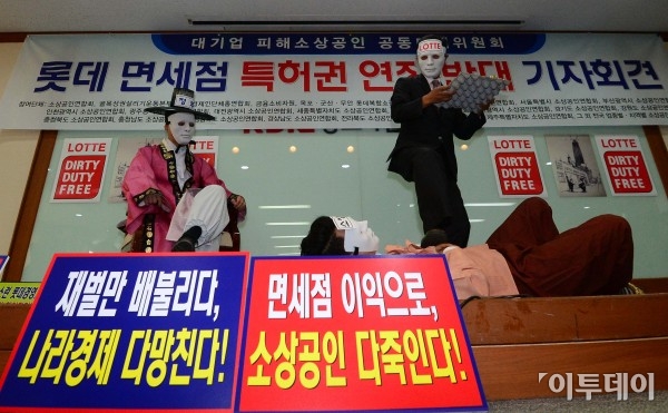 롯데 면세점 특허권 연장 반대 기자회견이 19일 오전 여의도 중소기업중앙회에서 열렸다. 대기업 피해 소상공인 공동대책위원회 관계자들이 롯데 면세점 특허권 연장을 반대하는 퍼포먼스를 하고 있다. 노진환 기자 myfixer@