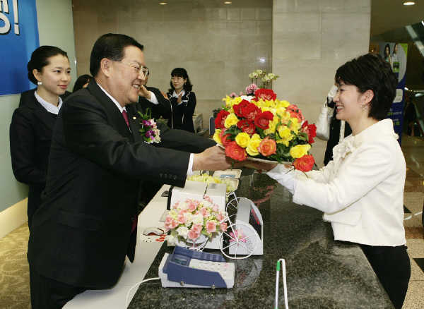 29일 취임식을 가진 우리은행 박해춘 은행장이 취임식 직후 본점(회현동 소재) 영업부 창구에서 취임 후 처음 맞이하는 고객에게 감사의 꽃다발을 전달했다.