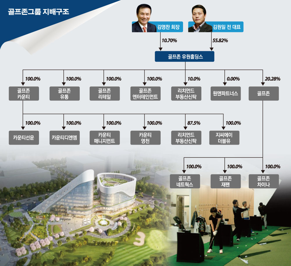 골프존유원홀딩스는 핵심 계열사인 골프존 지분 20.28%를 보유한 최대주주다. 골프존은 골프존유원홀딩스 외에도 김 전 대표와 김 회장이 각각 지분 18.18%, 14.99%를 보유해 오너일가의 지분율 합이 55.46%에 달한다. 골프존유원홀딩스는 이 밖에 골프존유통, 골프존리테일, 골프존카운티, 골프존엔터테인먼트, 골프존카운티선운 등 대부분 자회사와 손자회사의 지분 100%를 보유하고 있다.