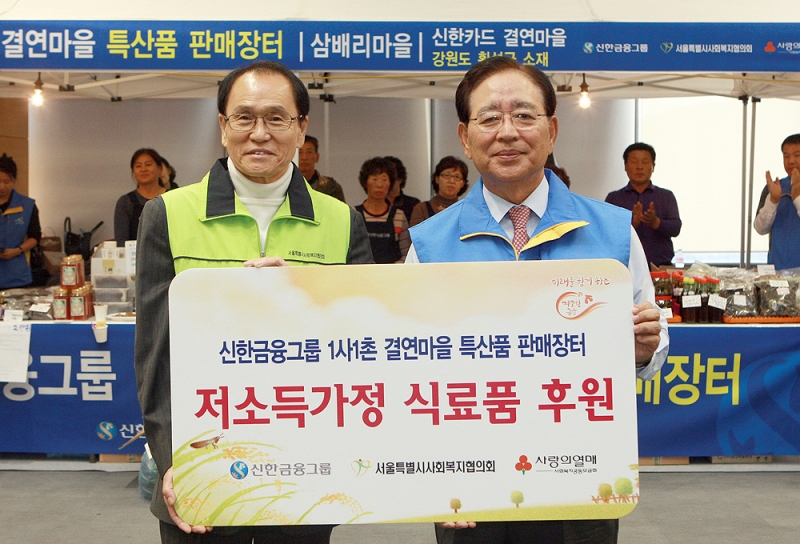 신한금융그룹은 5000만원 상당의 결연지역 대표 농산품(쌀, 된장 등)을 구매해 서울시사회복지협의회에기부했으며, 이날 기부된 농산품은 서울푸드뱅크를 통해 소외된 이웃들에게 전달될 예정이다.