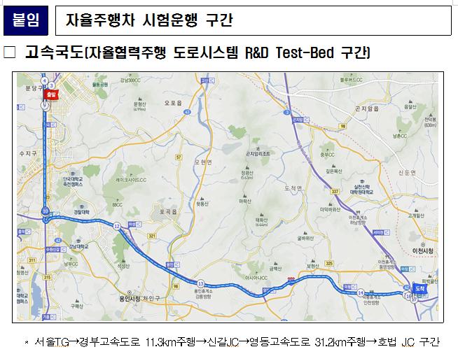 시험운행구간은 고속도로 1개 구간(경부고속도로 서울요금소-신갈분기점, 영동고속도로 신갈분기점-호법분기점, 41km)과 일반국도 5개 구간(수원, 화성, 용인, 고양 지역 등 320km)이다.