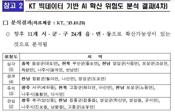 특히 빅데이터 기반 AI 확산위험도 모델 분석 결과(4차, 5차), 확산위험지역으로는 충북 음성, 전북 부안·고창·정읍 등 8개 시군이 지목됐다.