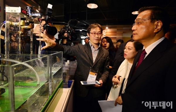 리커창 중국 총리가 2일 경기 성남 삼평동 경기창조경제혁신센터를 방문해 라온닉스 관계자에게 순간발열온수기에 대한 설명을 듣고 있다. 이날 리 총리는 창조경제혁신센터의 스타트업 육성 프로그램에 대한 설명을 듣고, 한국형 창조기업들의 현황을 살펴봤다. 신태현 기자 holjjak@