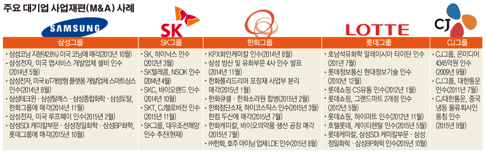 SK그룹과 마찬가지로 CJ그룹도 M&A를 매개체로 그룹의 핵심사업에 집중하고 있다. CJ그룹은 또 2011년 인수한 대한통운을 앞세워 물류사업을 글로벌로 확장하고 있다. 이를 위해 CJ대한통운은 지난 9월 중국 냉동물류기업인 룽칭을 인수했다.