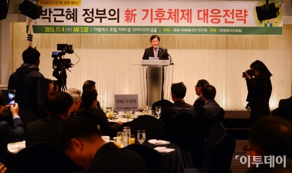 최경환 경제부총리 겸 기획재정부 장관이 4일 서울 반포동 팔래스호텔에서 열린 ‘국회 미래에너지 연구회 정책세미나’에 참석해 축사를 하고 있다. 이날 세미나에선 박근혜 정부의 신 기후체제 대응전략을 주제로 토론이 이뤄졌다. 신태현 기자 holjjak@
