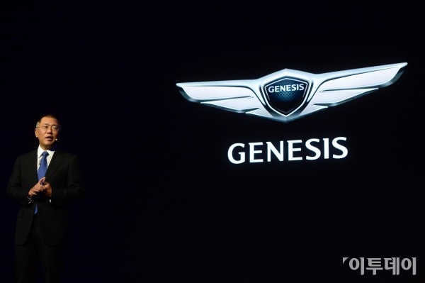 정의선 현대자동차 부회장이 4일 오전 서울 동대문디자인플라자(DDP)에서 열린 현대자동차 브랜드 전략 미디어 설명회에서 글로벌 브랜드 ‘제네시스’ 출범을 공식 발표하고 있다. 정의선 부회장은 “제네시스 브랜드 론칭을 계기로 세계 고급차 시장에서 현대차의 입지를 더욱 견고히 하는데 주력할 것”이라고 발표하며 제네시스 브랜드의 방향성을 제시했다. 노진환 기자 myfixer@