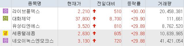 이밖에 라이브플렉스(종가 2210원), 유성티엔에스(종가 3520원) 등도 상한가 명단에 이름을 올렸다.