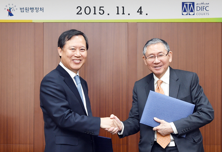 박병대 법원행정처장<사진 왼쪽>은 4일 서울 서초동 대법원 청사에서 박병대 법원행정처장과 마이클 황 두바이 국제금융센터(Dubai International Financial Center, DIFC) 법원장<사진 오른쪽>과 양해각서(MOU)를 체결했다.